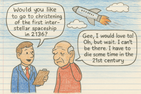 “Hello, sir. Would you like to go to the christening of the first inter-stellar spaceship in 2136?” “Gee, I would love too! Oh, but wait. I can’t be there. I have to die… Continue reading